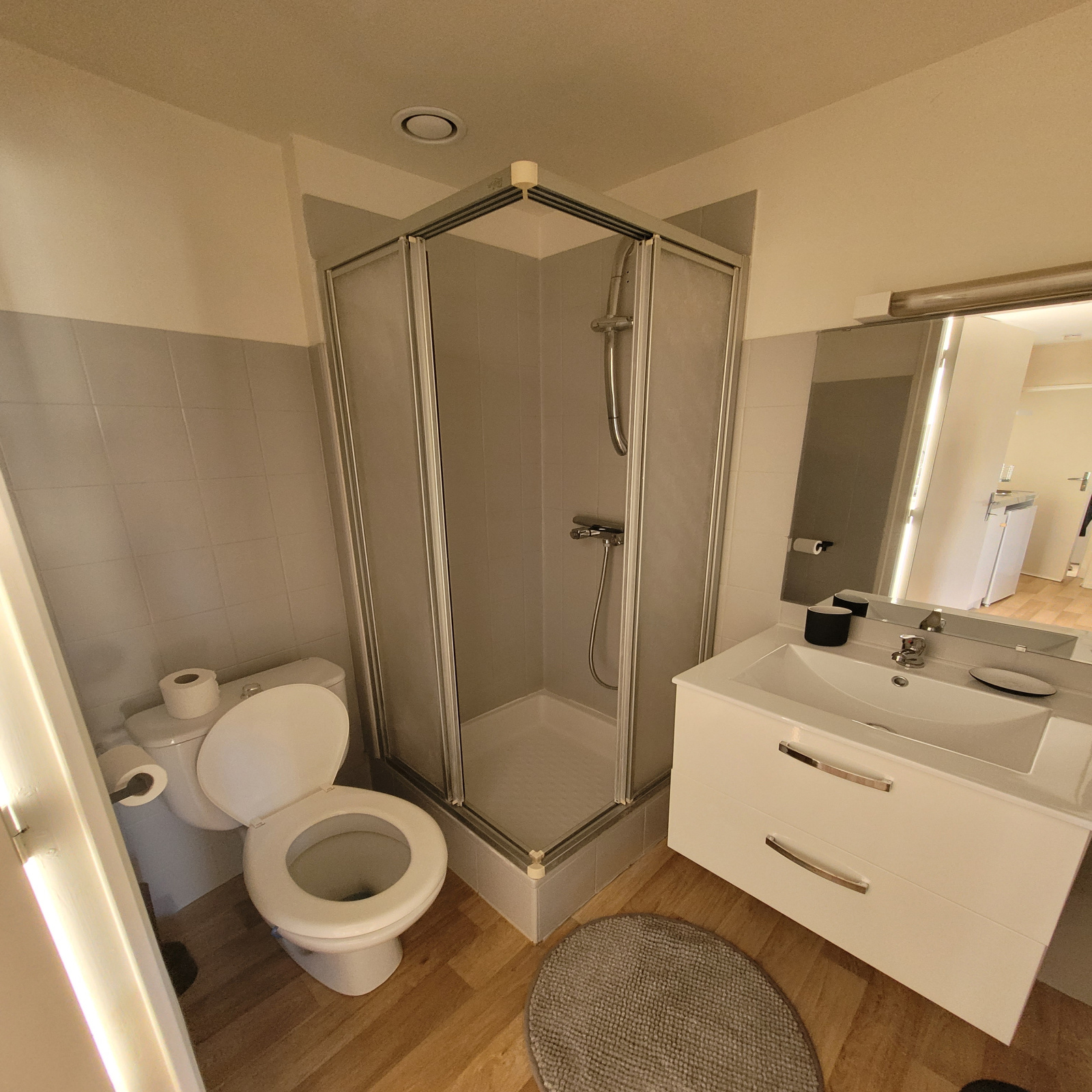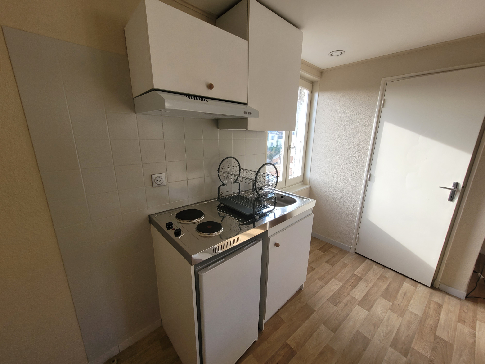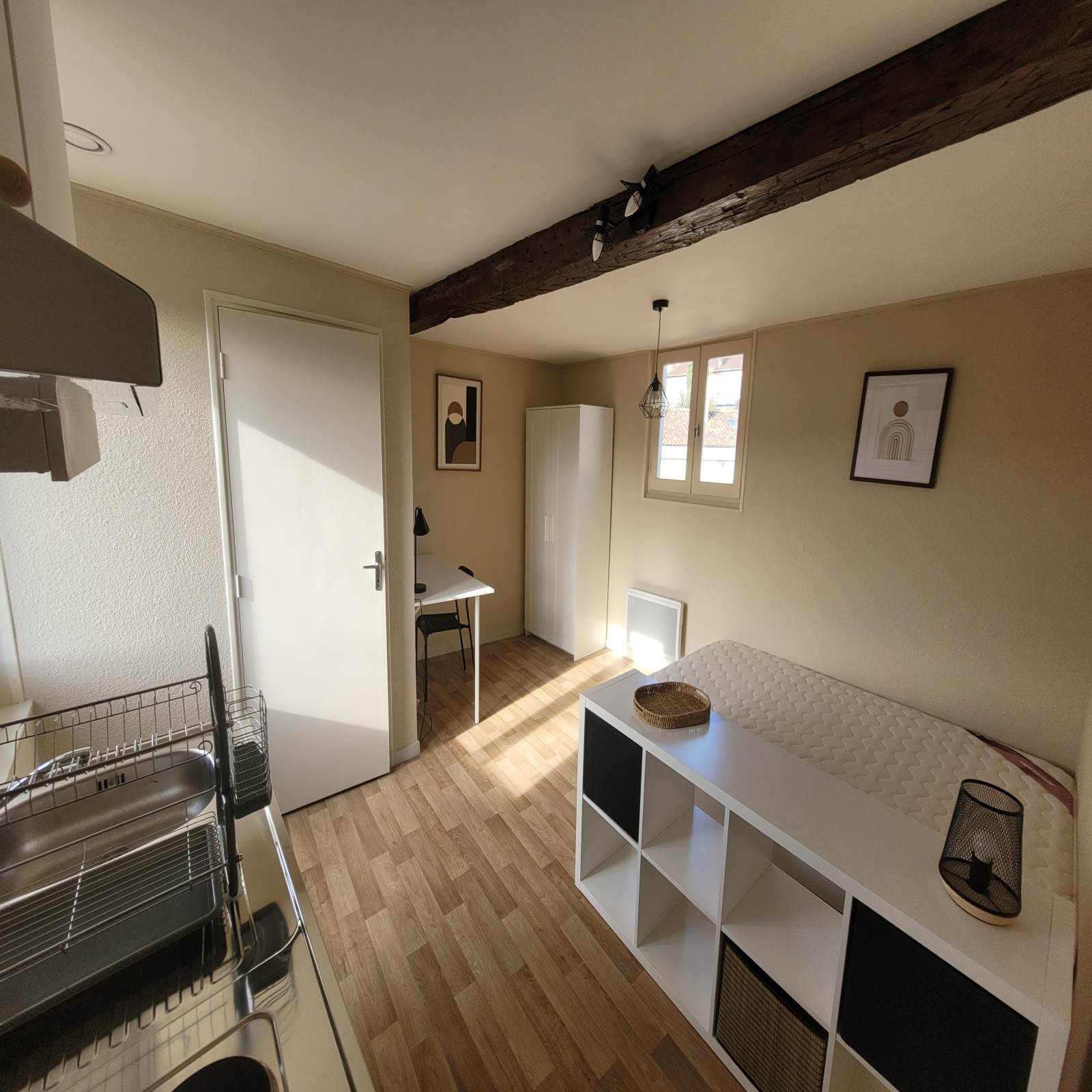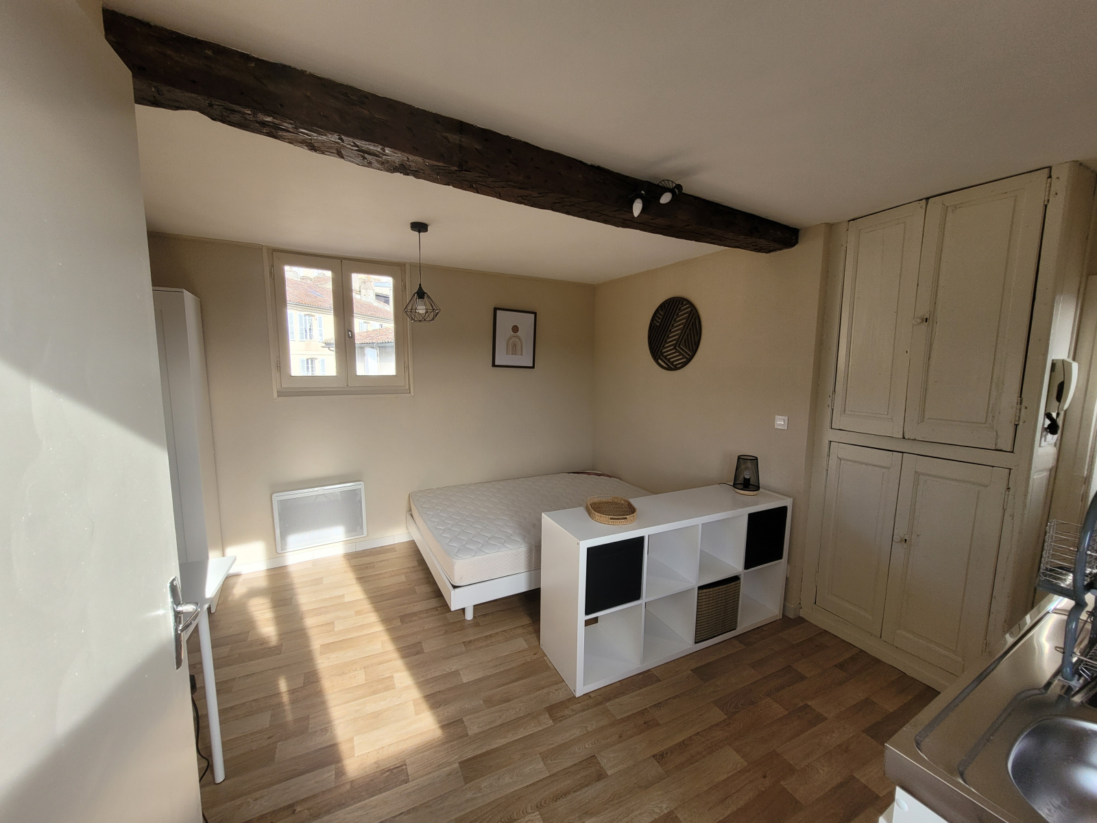La pièce de vie est baignée de lumière et se compose d'une kichnette avec équipements neufs (plaque de cuisson, frigo, hotte aspirante et vaisselle), d'une salle d'eau rénovée et d'un coin nuit avec un lit deux places.