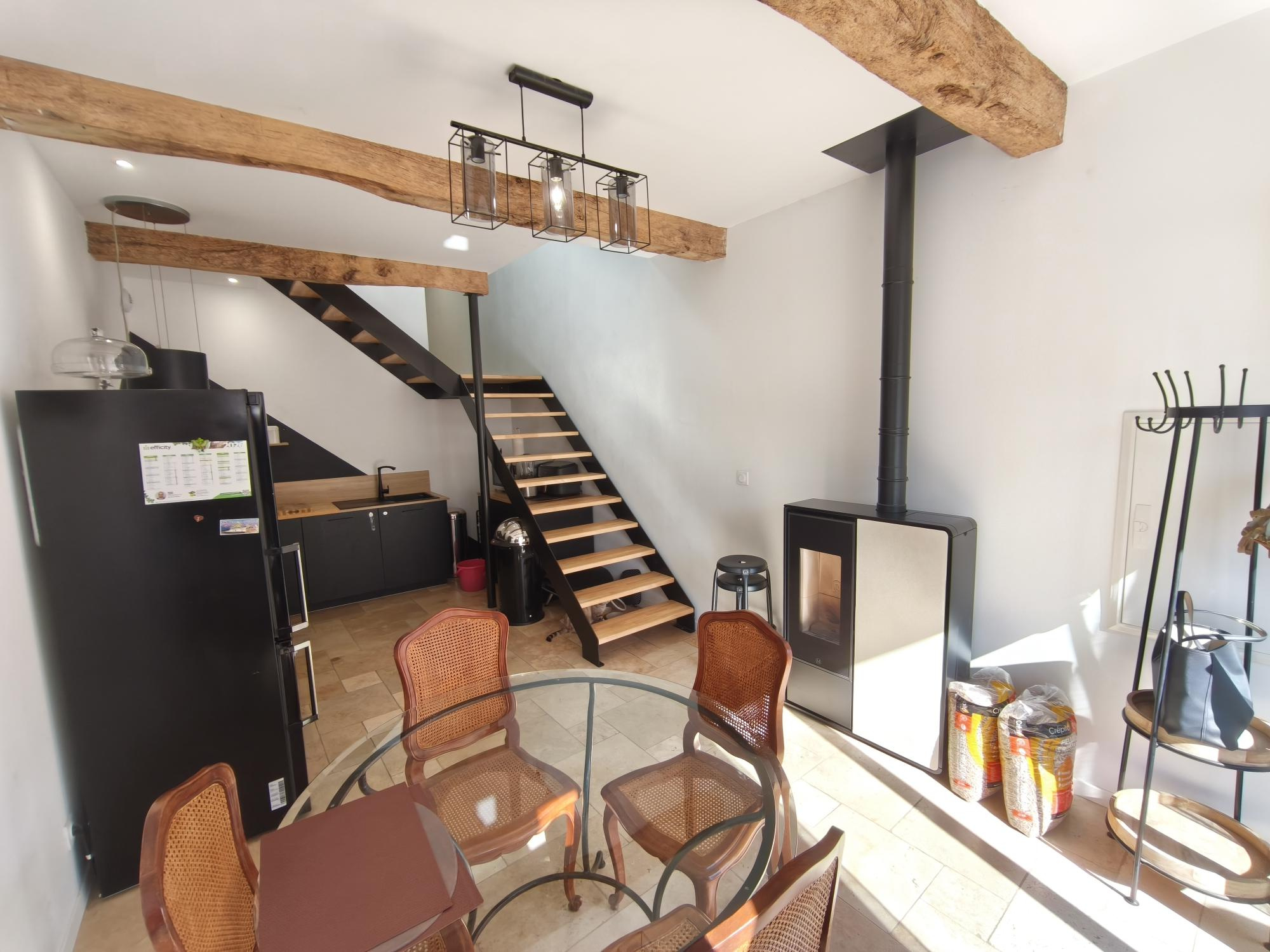 L'entrée s'ouvre sur une cuisine équipée de 22 m² avec un poêle à granules, un couloir dessert une magnifique salle bains en travertin avec douche, wc, buanderie et une chambre très cosy avec un accès par la rue. L'étage est composé d'un salon avec une très belle hauteur sous plafond avec poutres apparentes, 2 chambres dont une chambre parentale avec dressing et un wc complémentaire.
