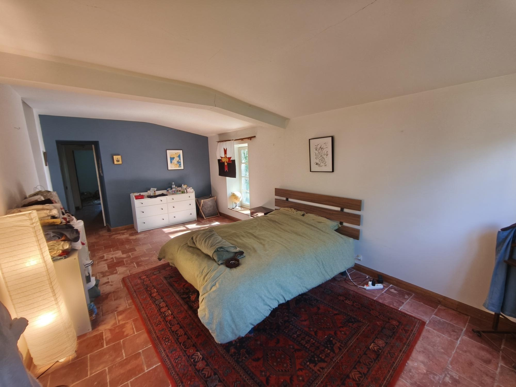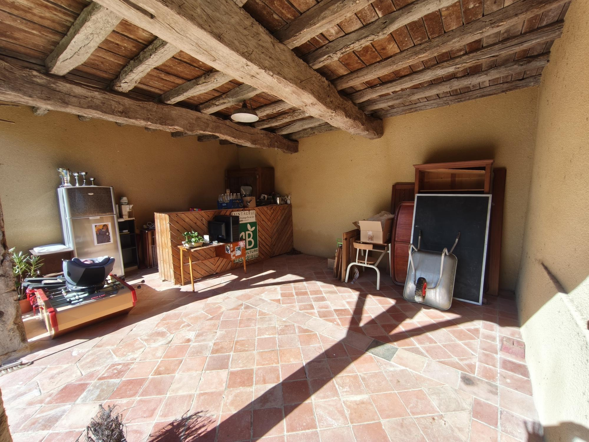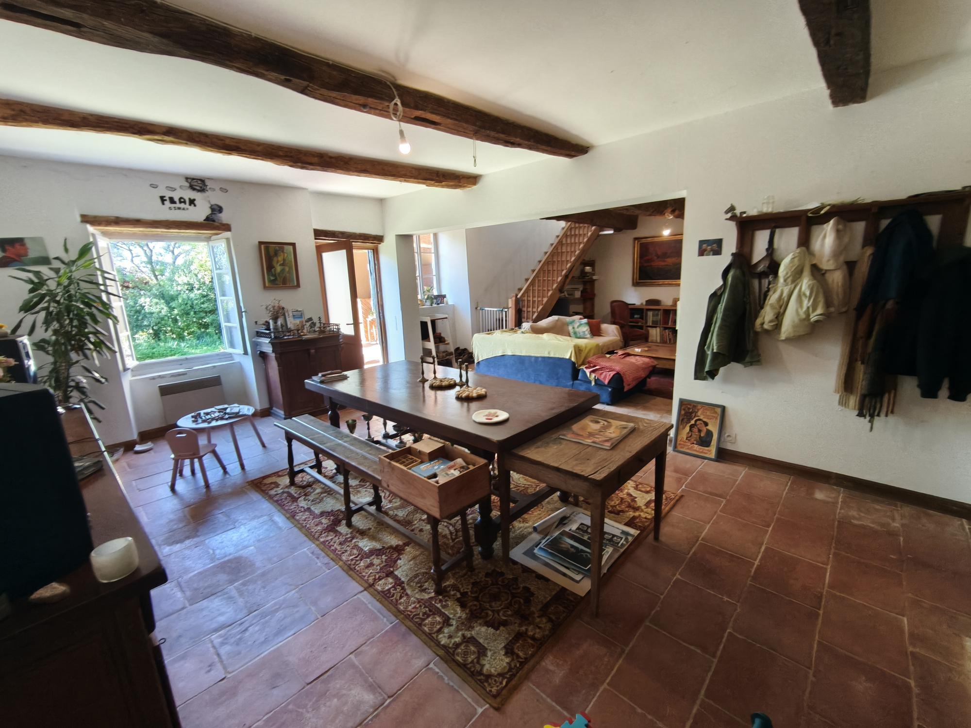 L'entrée s'ouvre sur un salon/salle à manger de plus de 60 m² avec grande cheminée ouverte et poêle à bois donnant sur une terrasse couverte de 25 m², cuisine séparée, 3 chambres dont une de plus de 20m² avec accès sur l'extérieur, salle de bains, cellier et wc.