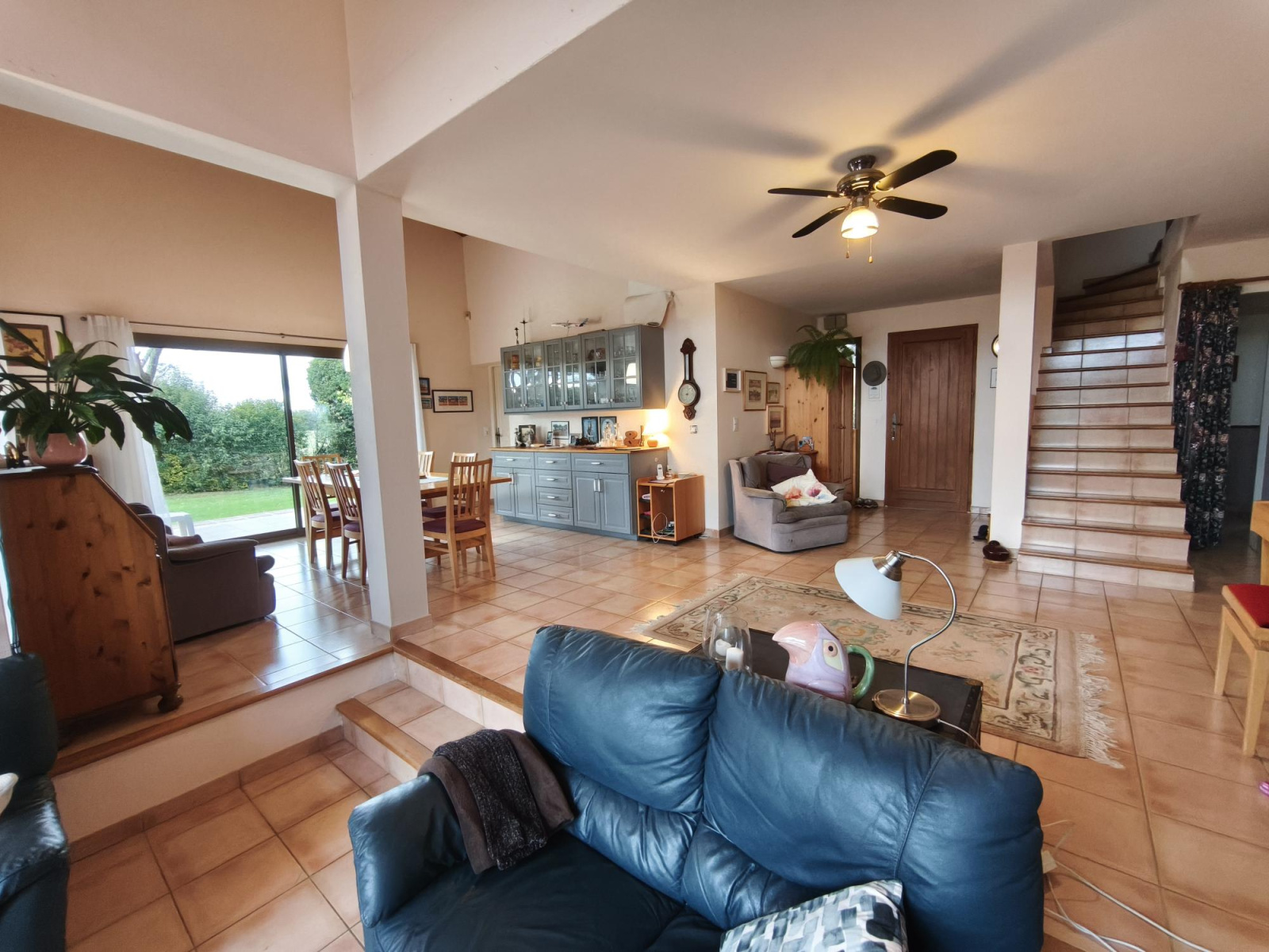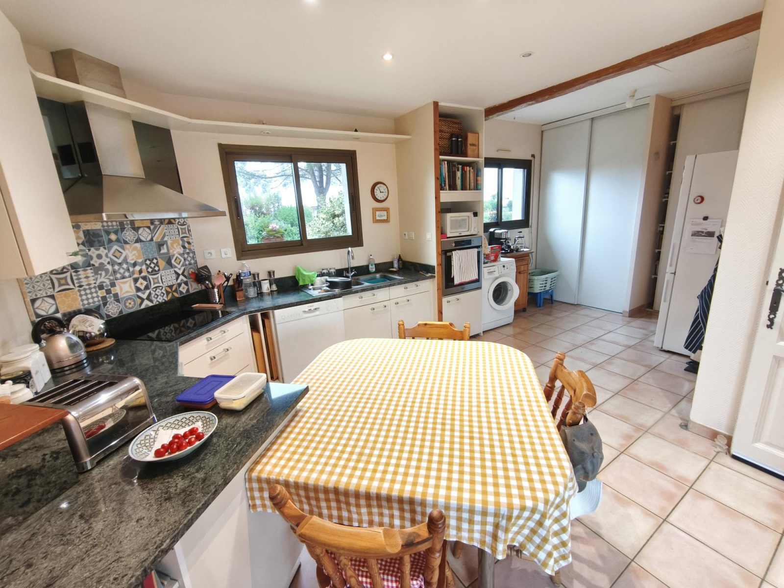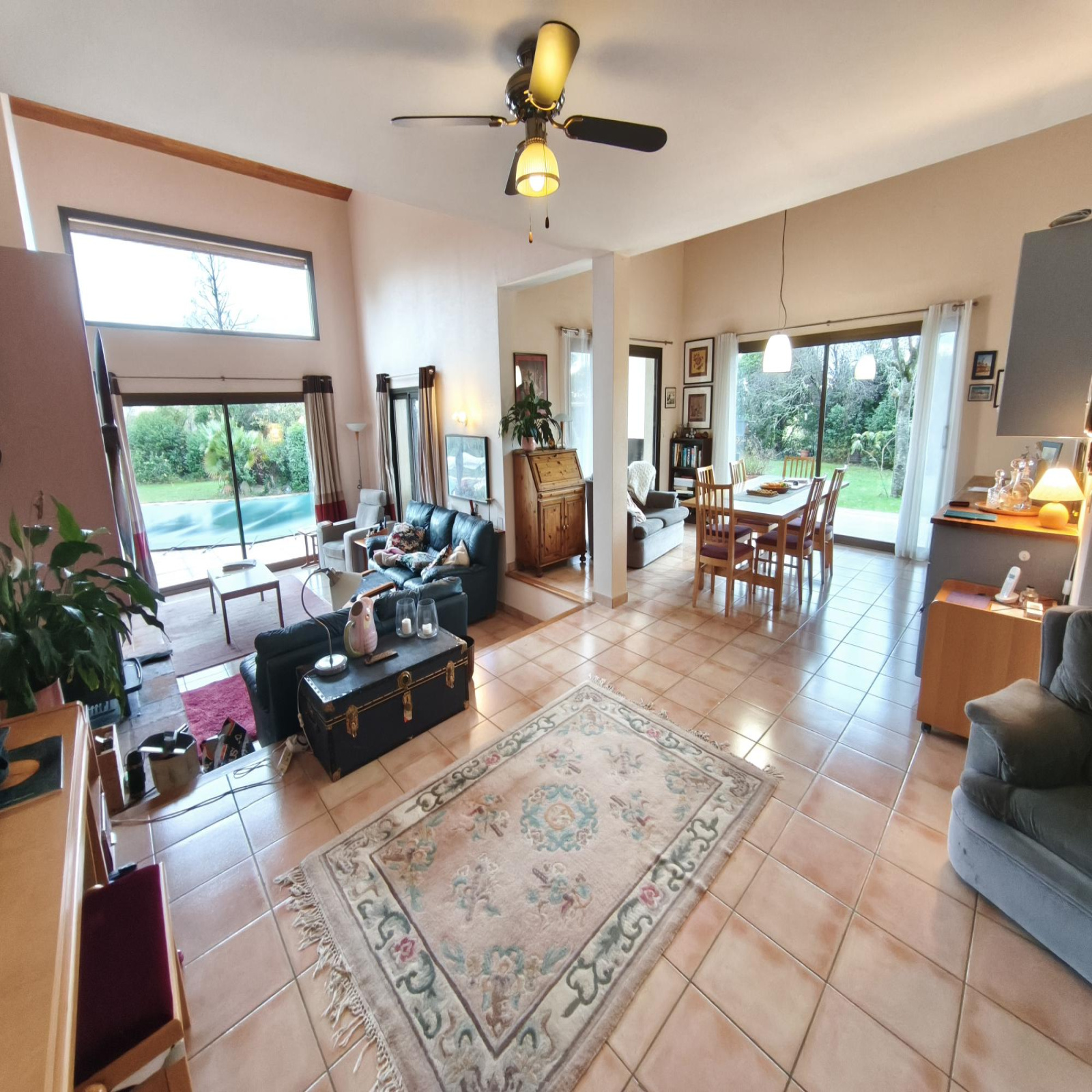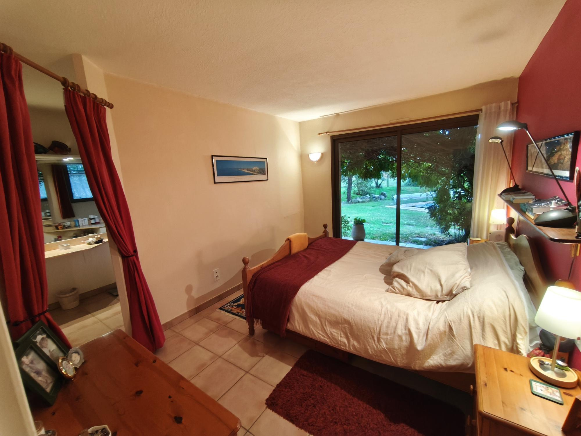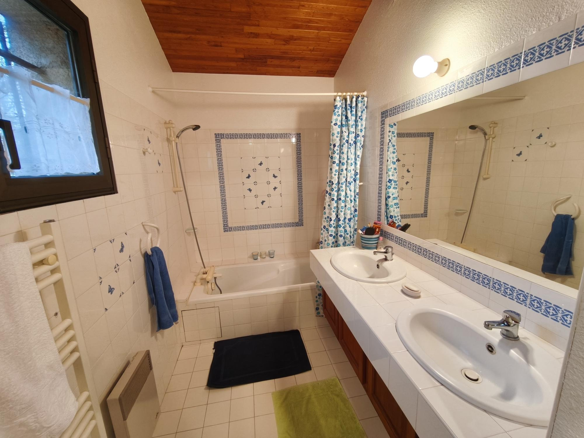 L'entrée s'ouvre directement sur un double salon avec cheminée baigné de lumière avec une salle à manger pour une surface totale de 62 m² donnant accès à la piscine 10 x 5 avec terrasse couverte, une cuisine séparée de 22 m², une chambre parentale avec dressing et salle d'eau, une deuxième chambre avec placard et salle d'eau et wc séparés.